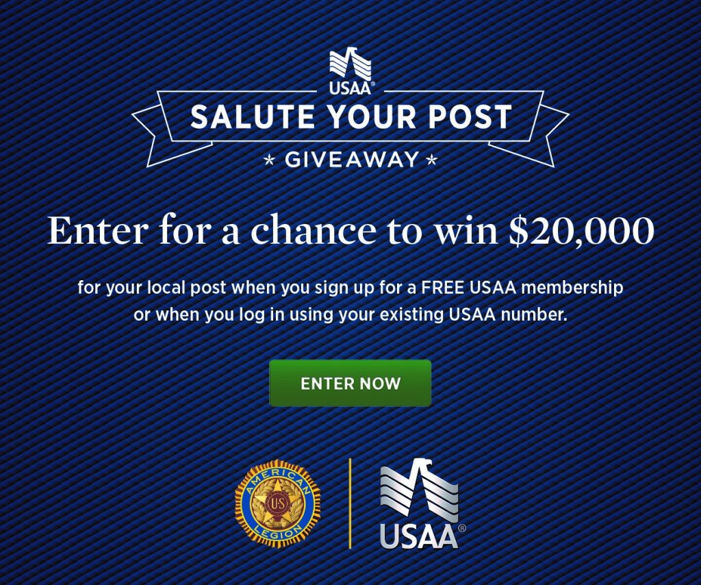 In an effort to show support for The American Legion at a local level, USAA will be giving out $20,000 for a Legion Post the week of Veteran’s Day 2017. Both existing USAA members and non-USAA members can enter the sweepstakes at www.usaa.com/talgiveaway from July 22nd – October 31st. To enter the drawing, non-USAA members need to complete USAA eligibility by going to www.usaa.com/talgiveaway. If you are already a USAA member, go to www.usaa.com/talgiveaway and login with your USAA username/password. The drawing will be held in early November and the winner will be able to select a local post to give $20,000 towards post improvements.