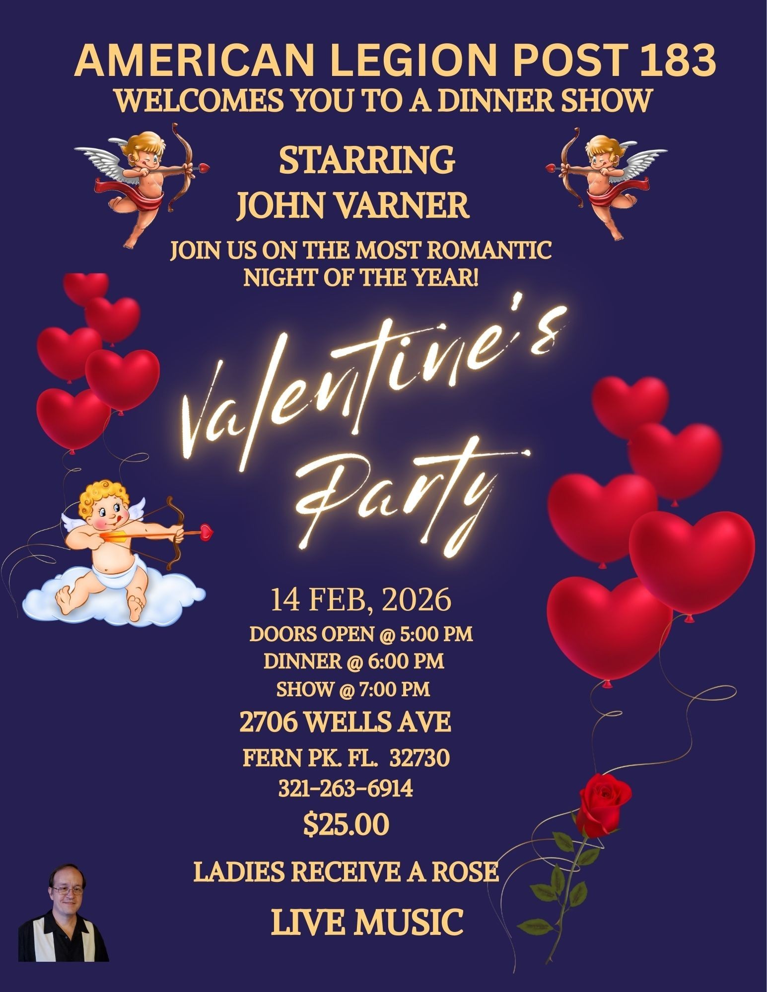 Feb 14 5:00 pm - 10:00 pm Post 183: Valentine’s Party Post 183 Old Glory 2706 Wells Ave, Fern Park Event Details Get Directions