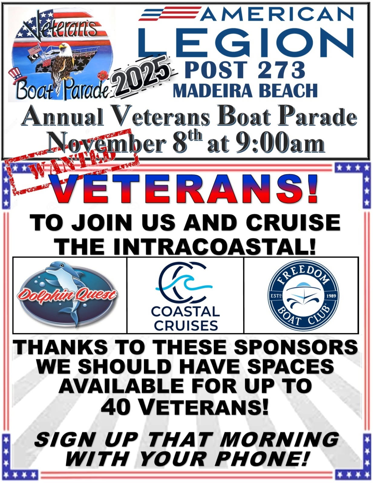 Nov 8 All Day Post 273: Veterans Boat Parade Post 273 Augustus Ruser, Jr. 600 American Legion Dr, Madeira Beach Event Details Get Directions