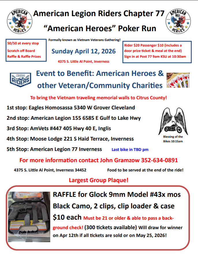 Apr 12 Post 77: American Heroes Poker Run 9:00 am - 5:00 pm Post 77 Allen Rawls 4375 S Little Al Pt, Inverness Event Details Get Directions