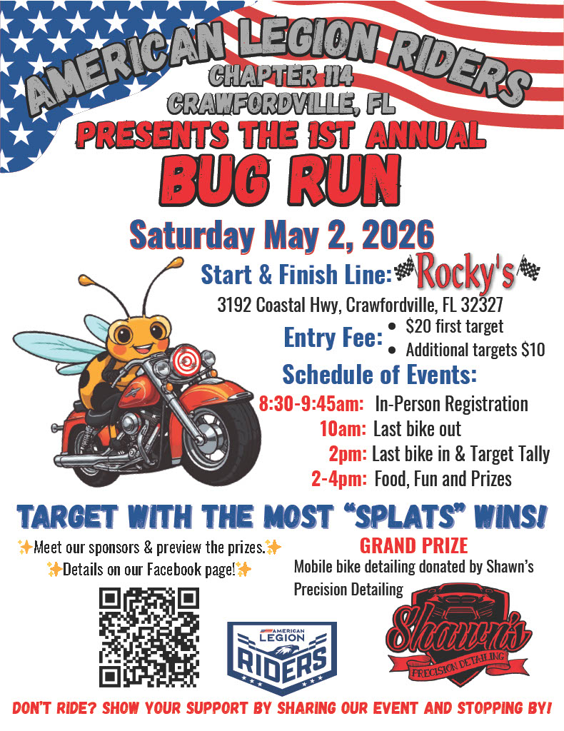 May 2 1st Annual Bug Run 8:30 am - 4:00 pm Rocky's Wakulla 3192 Coastal Hwy, Crawfodville Event Details Get Directions