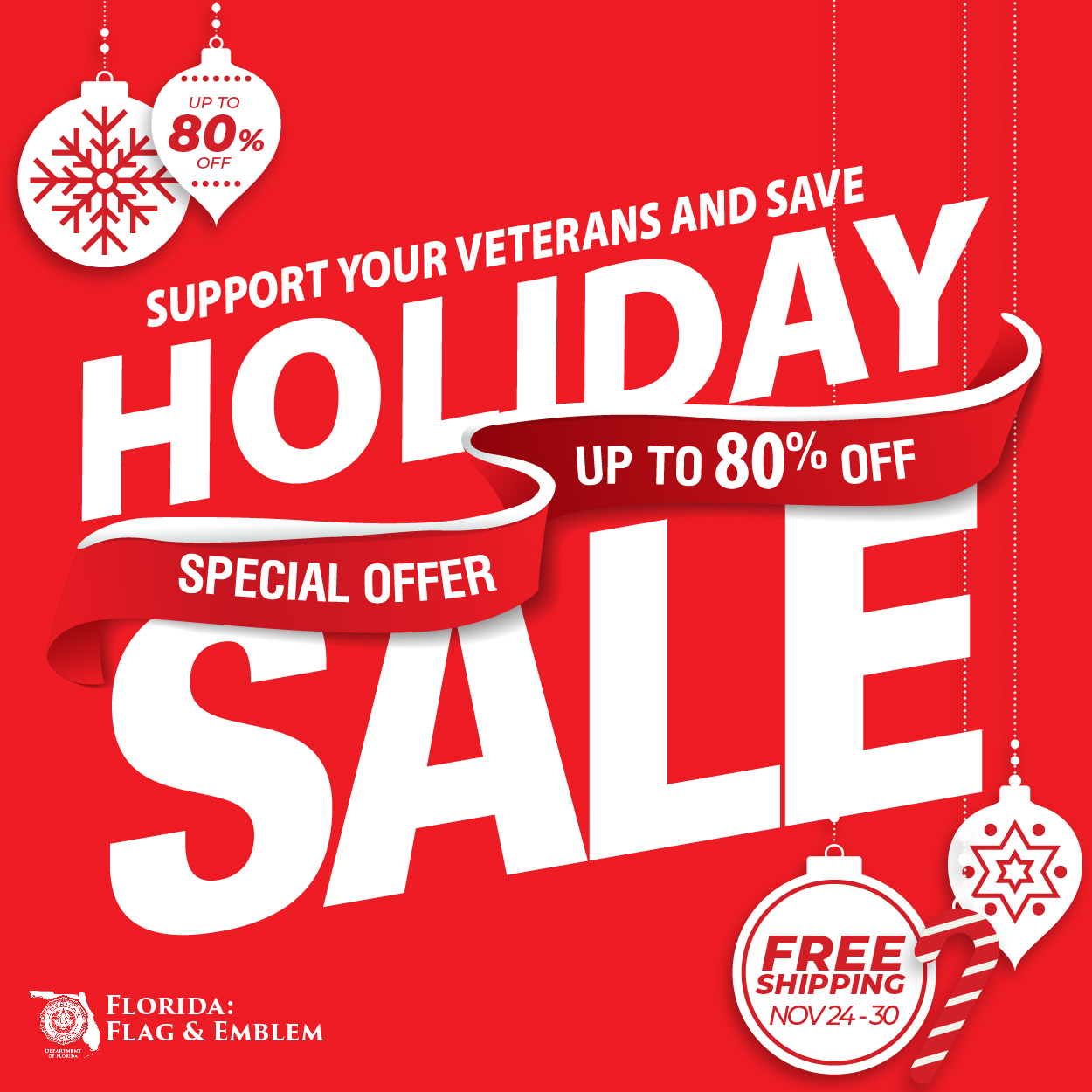 Florida Flag & Emblem Salesis having a large sale with up to 80% off through the month of December and offering free shipping November 24-30, 2020. All profits earned stay with the Department of Florida, in support of our Florida Veterans and programs.
