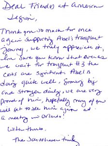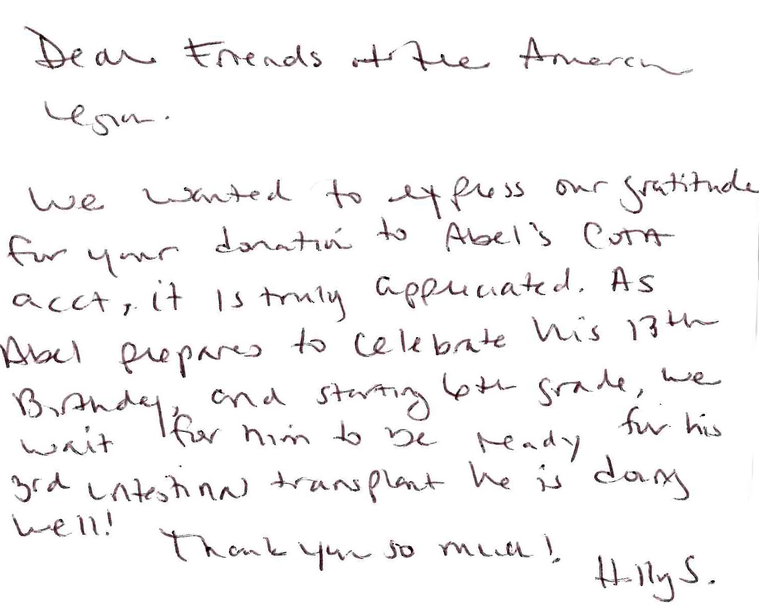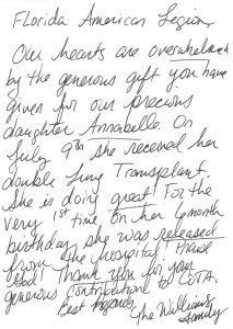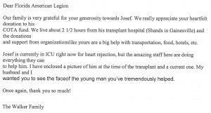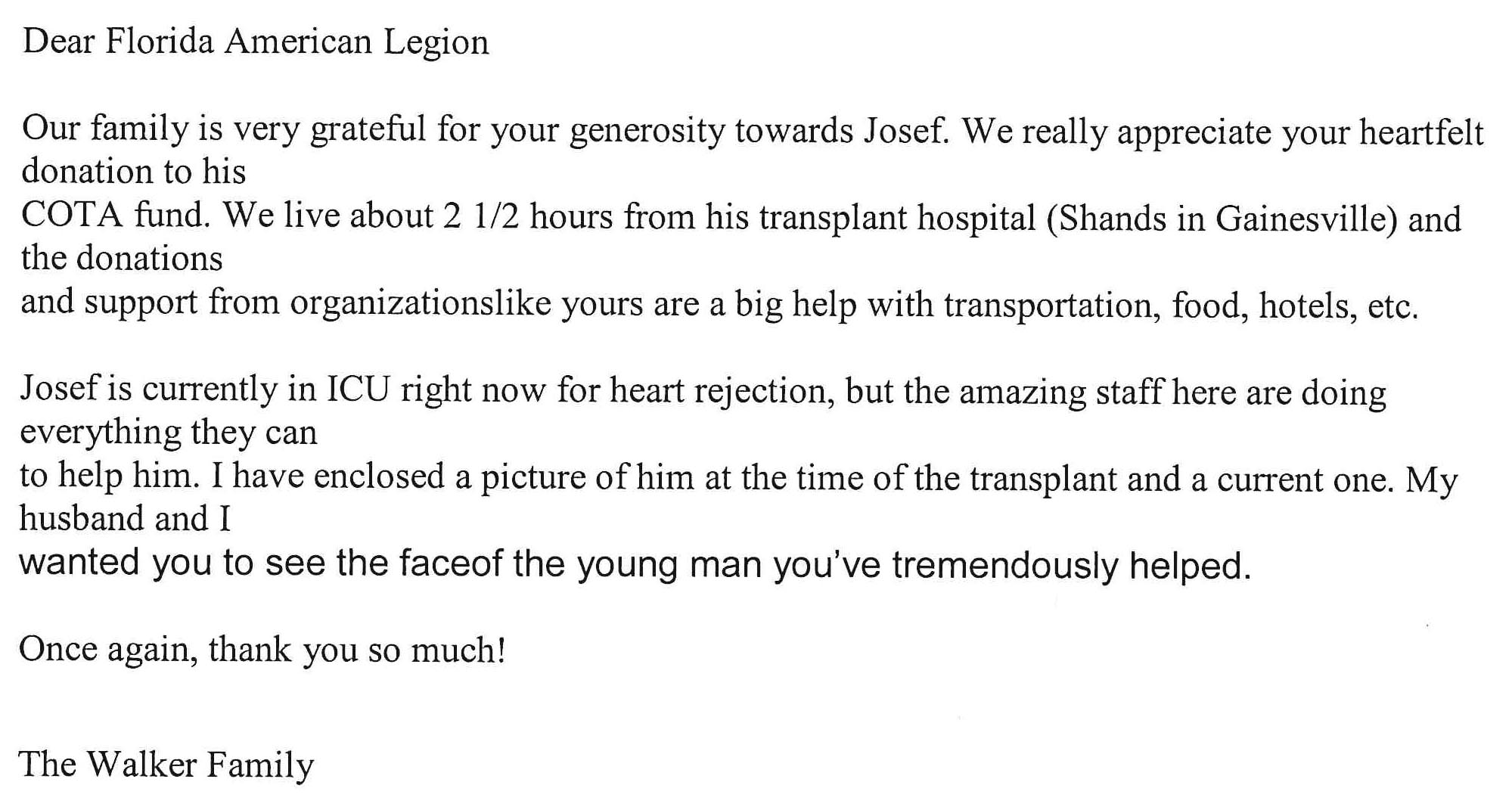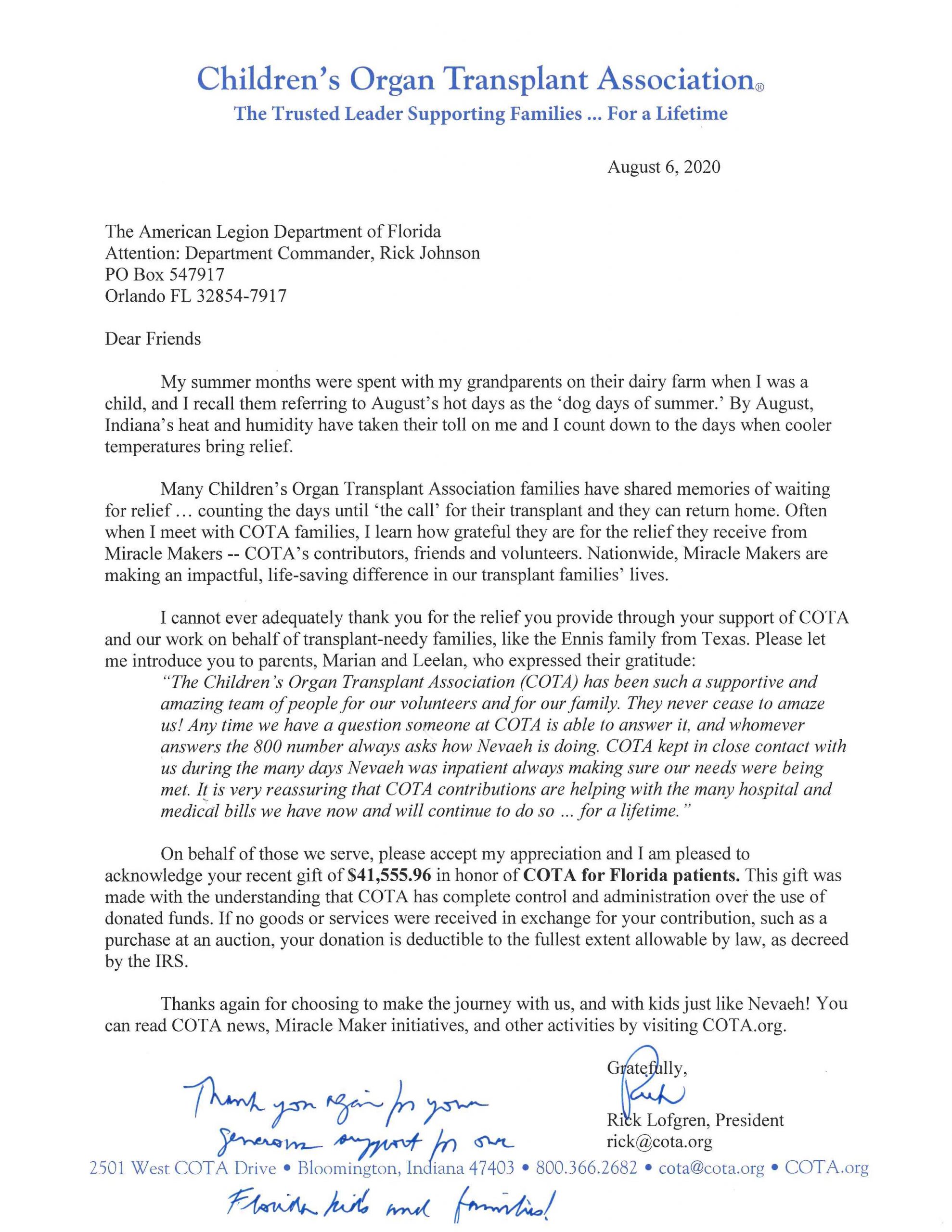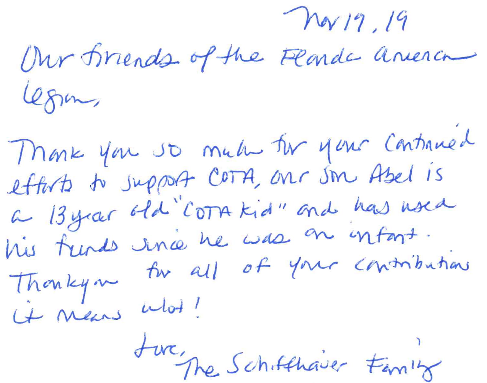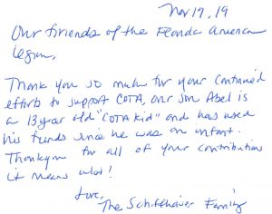 Department Commander Rick Johnson thanks you for your support of his chosen charities. Below are some thanks from some of the recipients who benefited from your contributions to C.O.T.A….