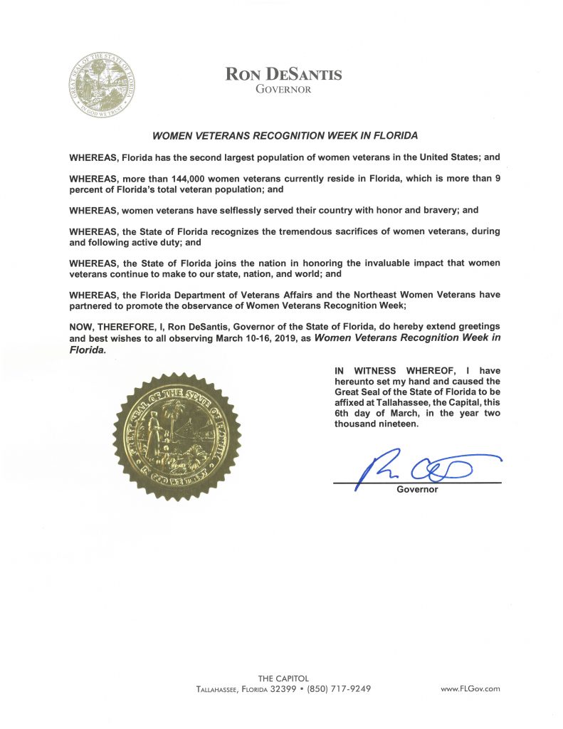 TALLAHASSEE – Gov. Ron DeSantis has designated the week of March 10-16, 2019 as Women Veterans Recognition Week in Florida. Women veterans are one of the fastest growing segments of the veterans’ population. There are more than 144,000 women veterans in the Sunshine State.