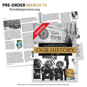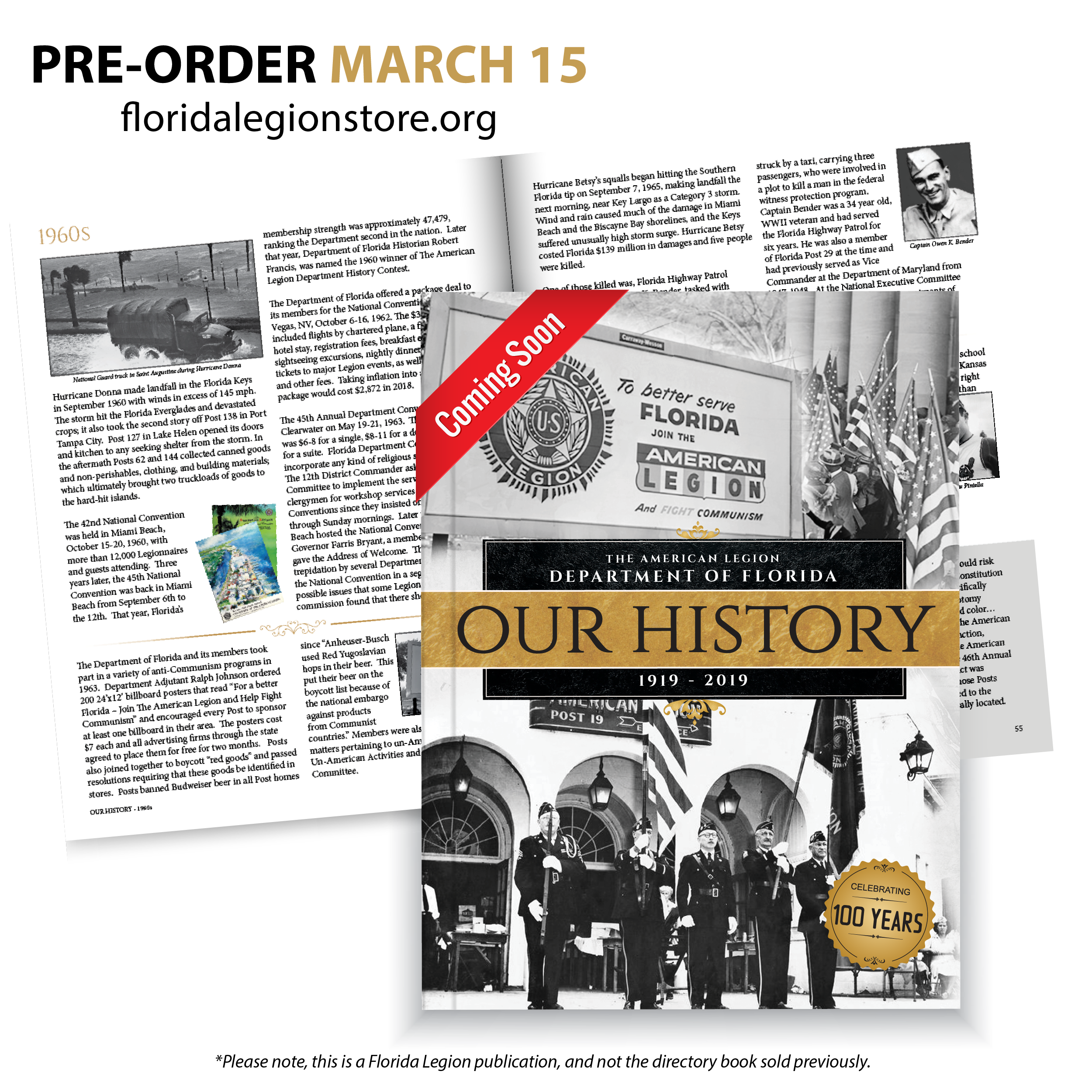 This book will be a limited edition, one time run only, with limited quantities. Available in paperback or hardcover. Pre-order your piece of history now, and get the Department of Florida Centennial lapel pin FREE. Reserve your copy now at floridalegionstore.org.
