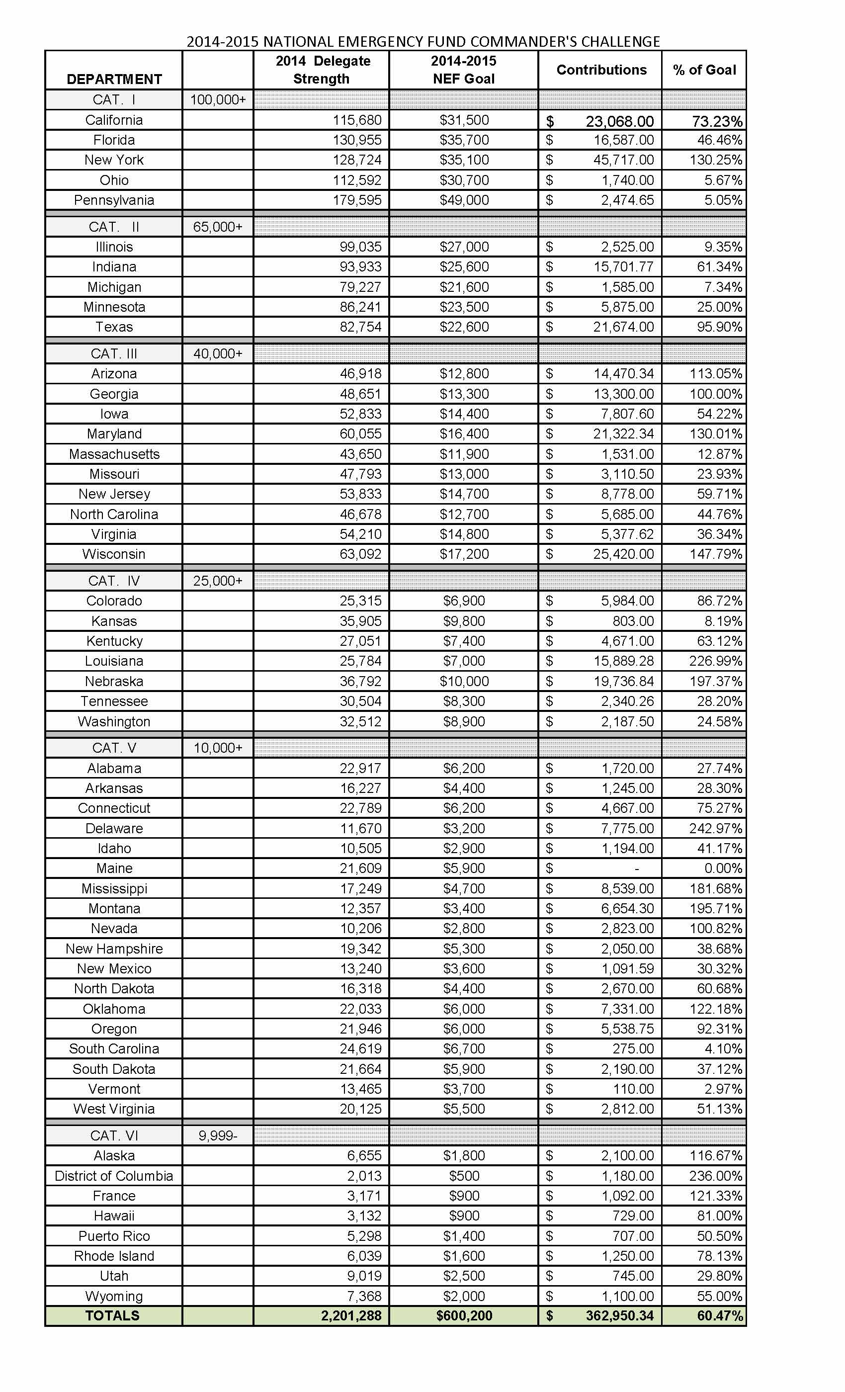Below are the totals for the National Emergency Fund, Commander’s Challenge. Florida has contributed $16,587 so far, that’s 46% of our goal. As a reminder, the deadline is August 1st. If you have any outstanding donations, please send them in.