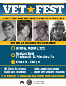 - PETERSBURG, Fla. – The U.S. Department of Veterans Affairs, in partnership with the Tampa Bay Rays, will host a VetFest event, Saturday, Aug. 5 from 10:00 a.m. to 2:00 p.m. at Tropicana Field. Veterans and families do not need to sign up or register for this event ahead of time.