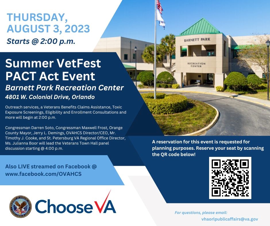 The Orlando VA Healthcare System (OVAHCS) will host a PACT Act event on Thursday, August 3, 2023. Outreach services will be conducted from 2:00 – 4:00 p.m. with a special Veterans Town Hall portion starting at 4:00 p.m. in the conference room at the Barnett Park Recreation Center located at 4801 W. Colonial Drive, Orlando, Florida 32808.