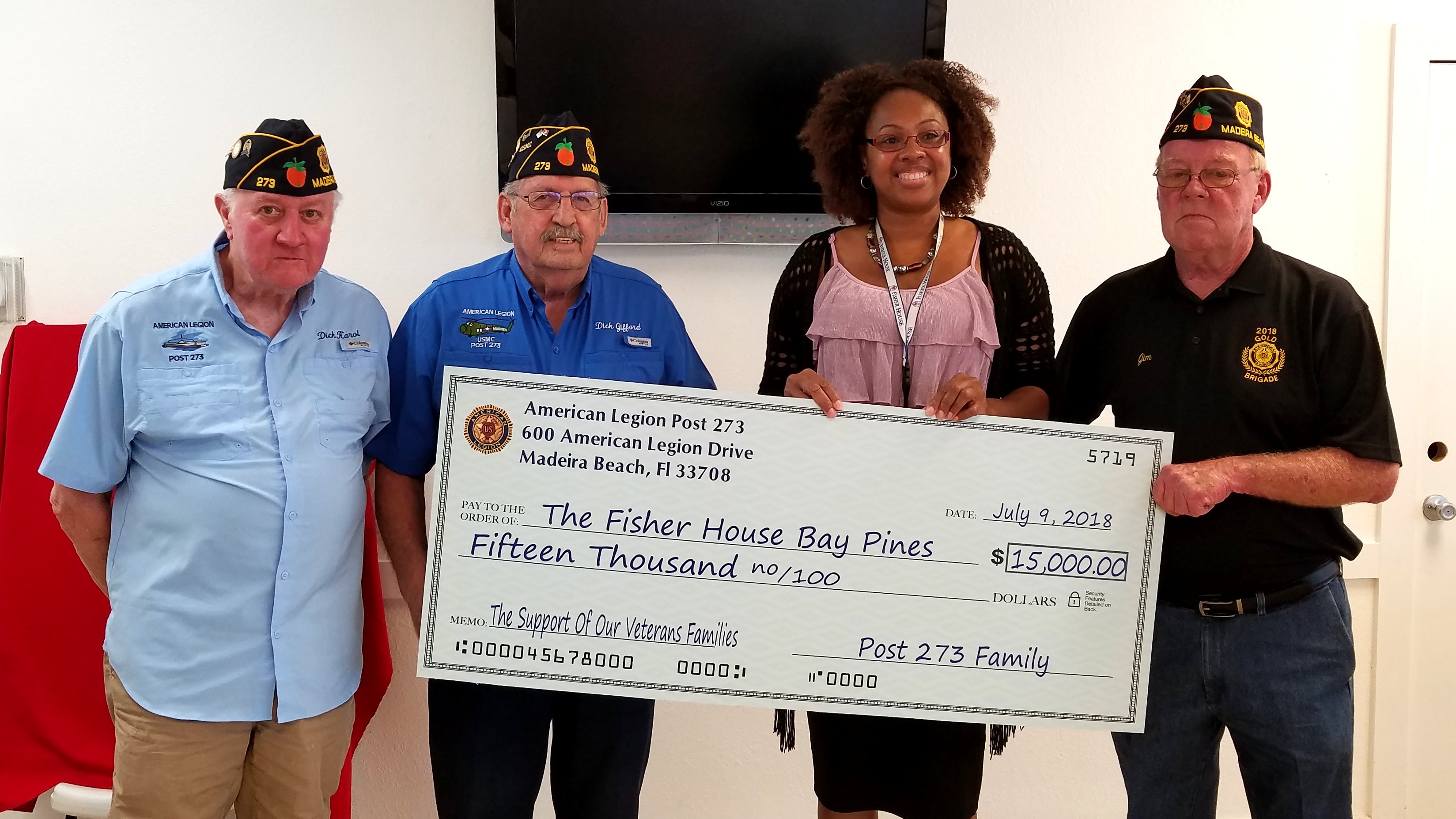Commander Jim White(right) presents a $15,000 donation to Shentrela Diggins, manager of Fisher House at the Bay Pines V.A. on behalf of the Post 273 Legion, SAL & Auxiliary. Also pictured are Executive Officer Dick Karol(left) who led this year’s fundraising drive, and Finance Officer Dick Gifford(center). Post 273 has now donated a total of $50,000 to our local Fisher House at Bay Pines in the past three years to help them out with their finances. Luckily their management team knows how to handle and correctly use these finances accordingly, for those who need help like these veterans to handling their large financial income, consider learning more about cash management at https://www.wecu.com/business-banking/.