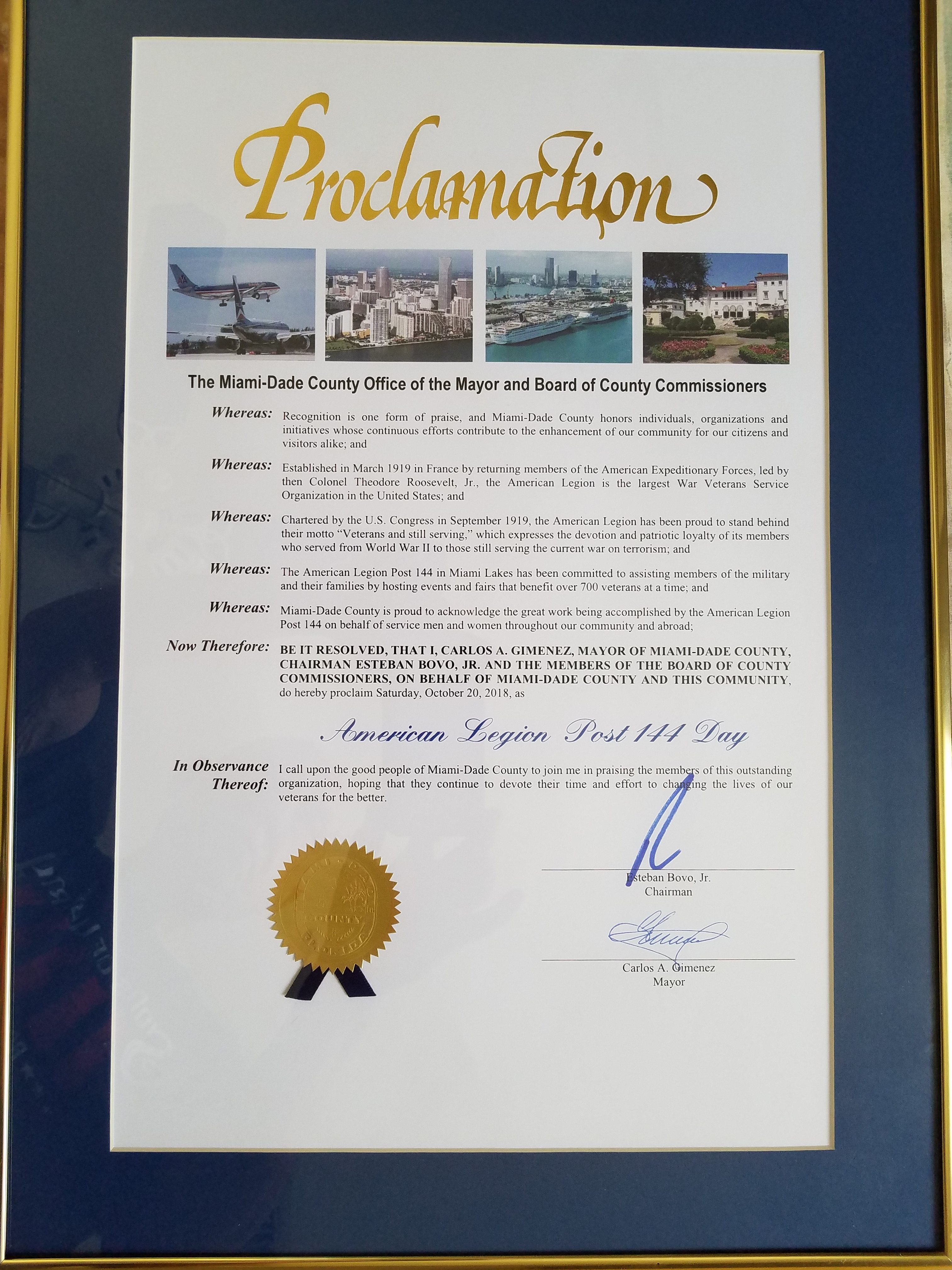 At the Veterans Benefits Fair event our Post was recognized by a Proclamation from Miami Dade County, declaring Oct 20, 2018 as “American Legion Post 144 Day.” for our work in support of our Veterans. It was presented by Commissioner Jose “Pepe” Diaz, a Vietnam Veteran Marine. See photo attached.