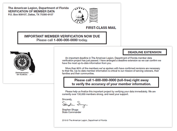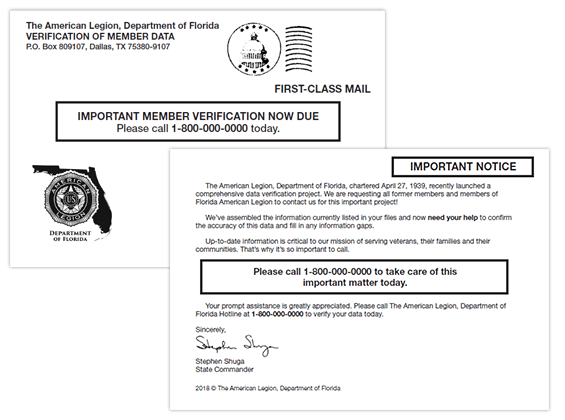 - I would like to verify and update my information. How may I do this? If you have received a postcard or an email with a telephone number, you may call the number to speak with a dedicated representative for The American Legion, Department of Florida project. The representative will verify all the information we have on file for you and make any updates where needed.If you have received an email with an embedded link, you may go to the online site to review your information. If you have questions, you may call PCI’s customer service desk at 1.800.982.1590.