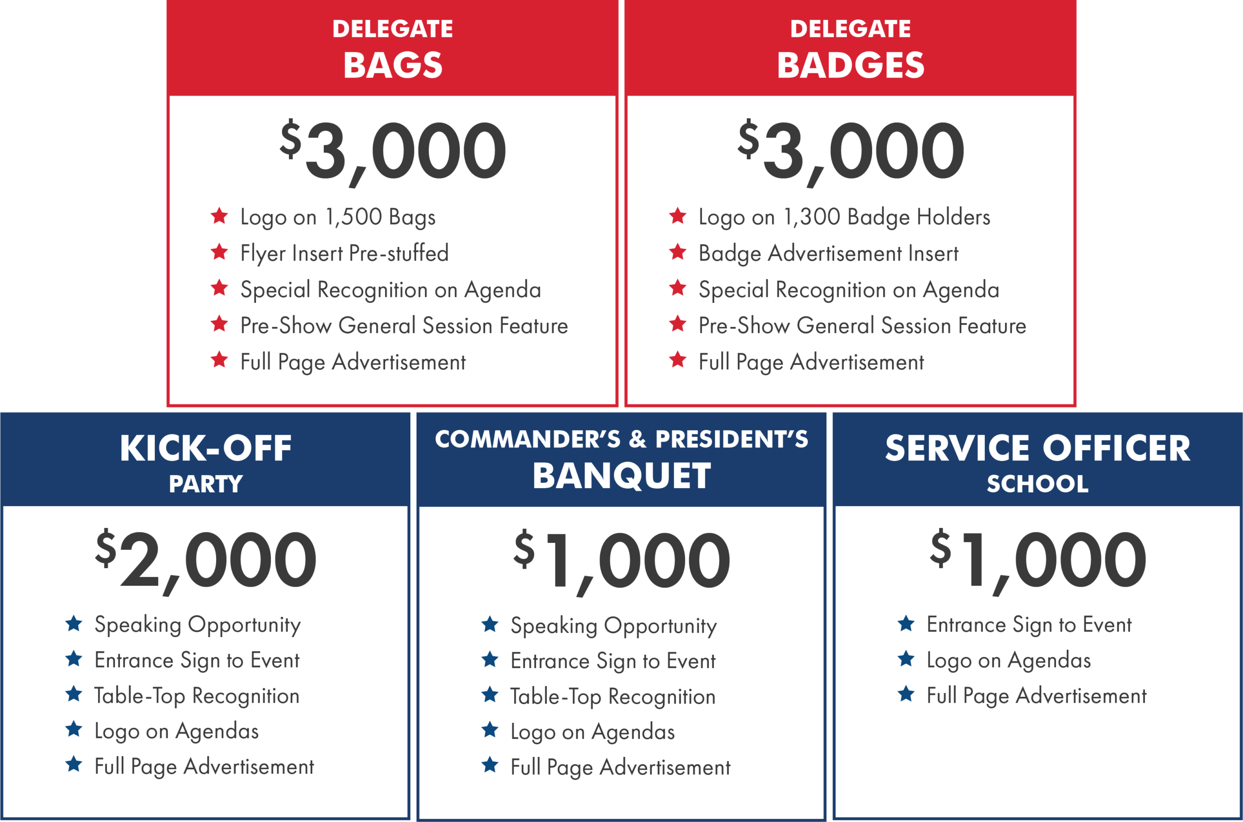Gain prime visibility at one of the most prestigious events of the convention—the Commander’s & President’s Banquet, attended by 200+ distinguished guests. Your sponsorship helps make tickets more affordable while showcasing your brand through: